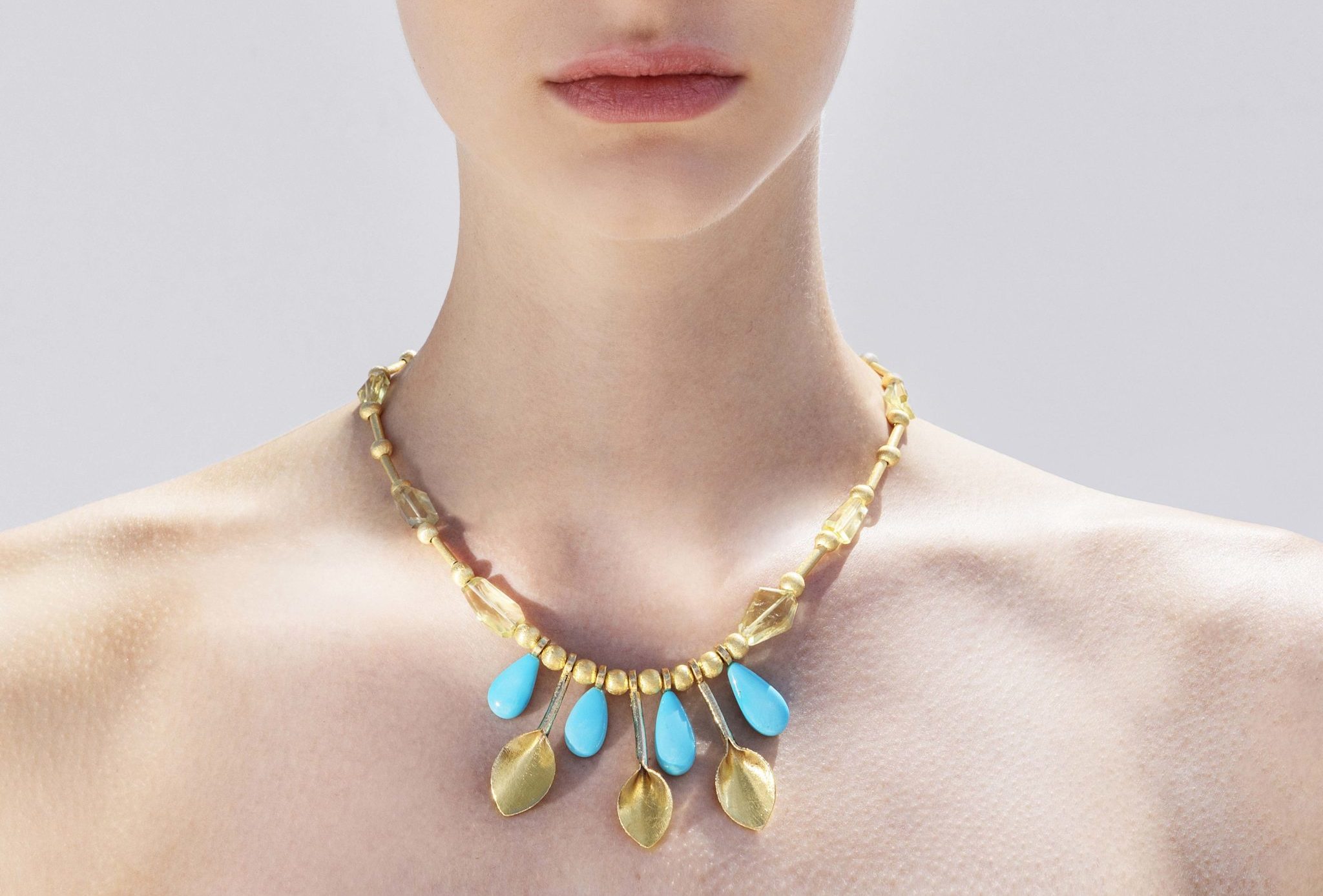 Category: Petranova NecklacesGold-plated necklace with turquoise and lemon quartz — a zesty mix of sunlit yellow and ocean blue, crafted to stand out.