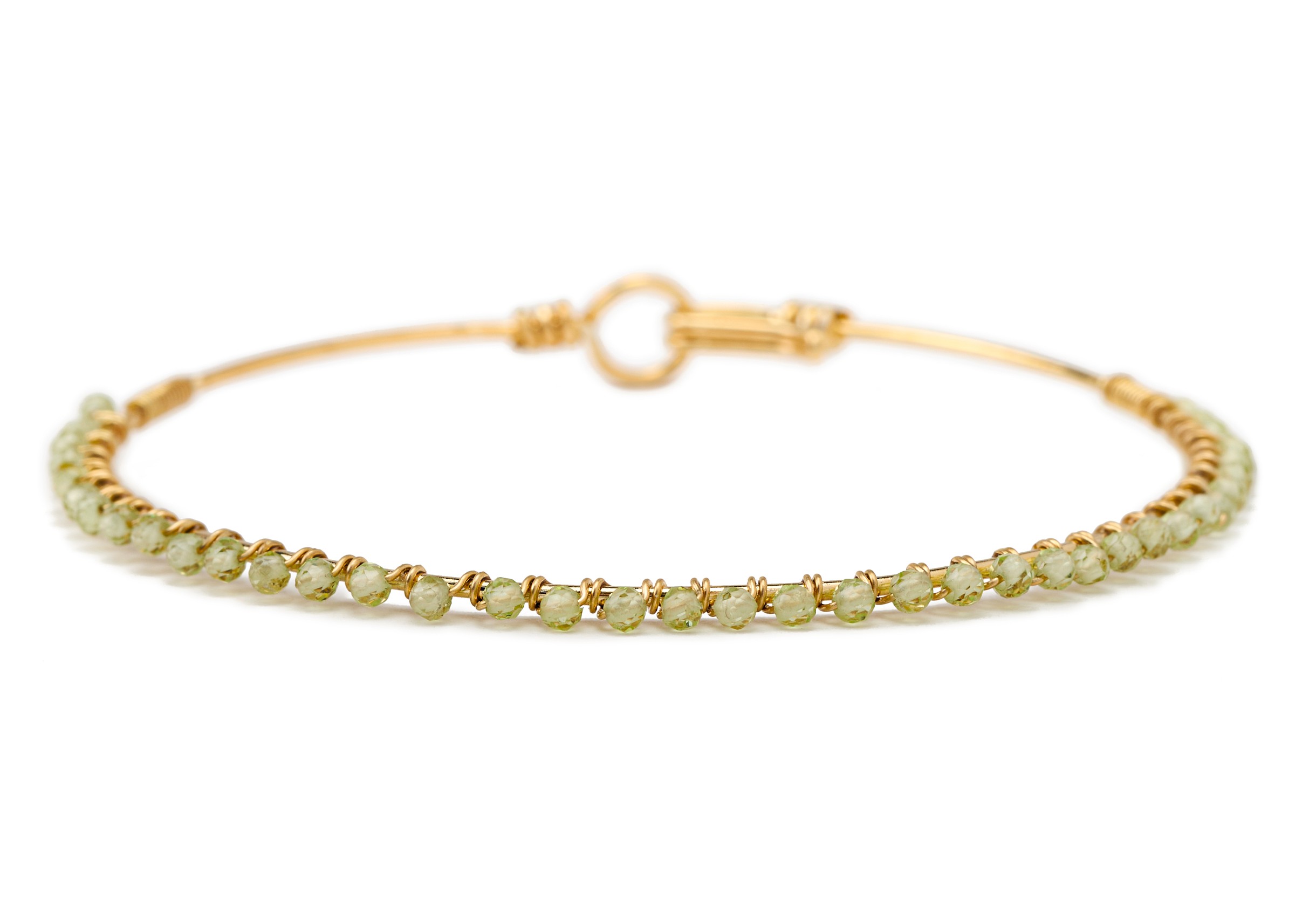 A gold-plated bracelet set with peridot semi precious stones, rich, refined, and sophisticated.