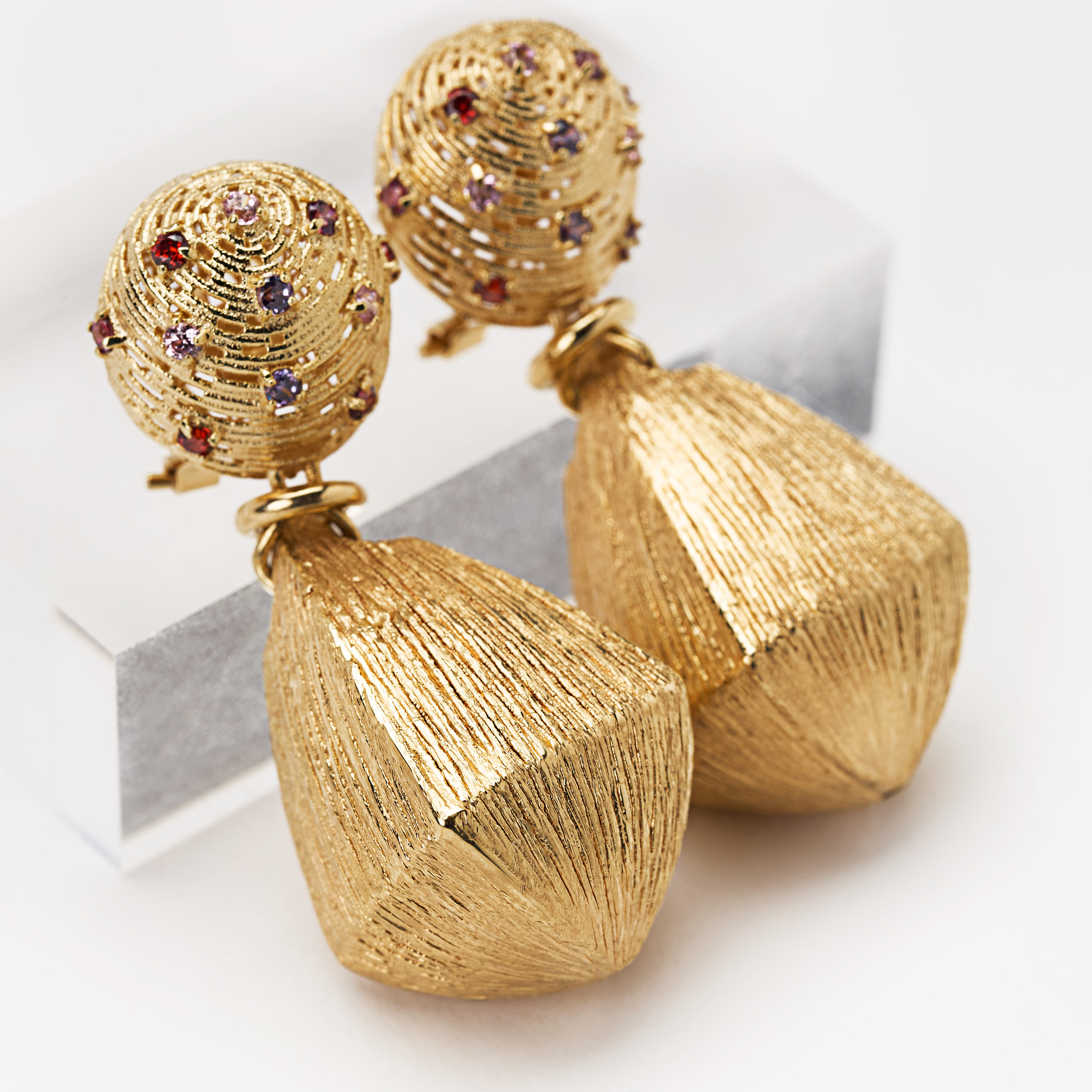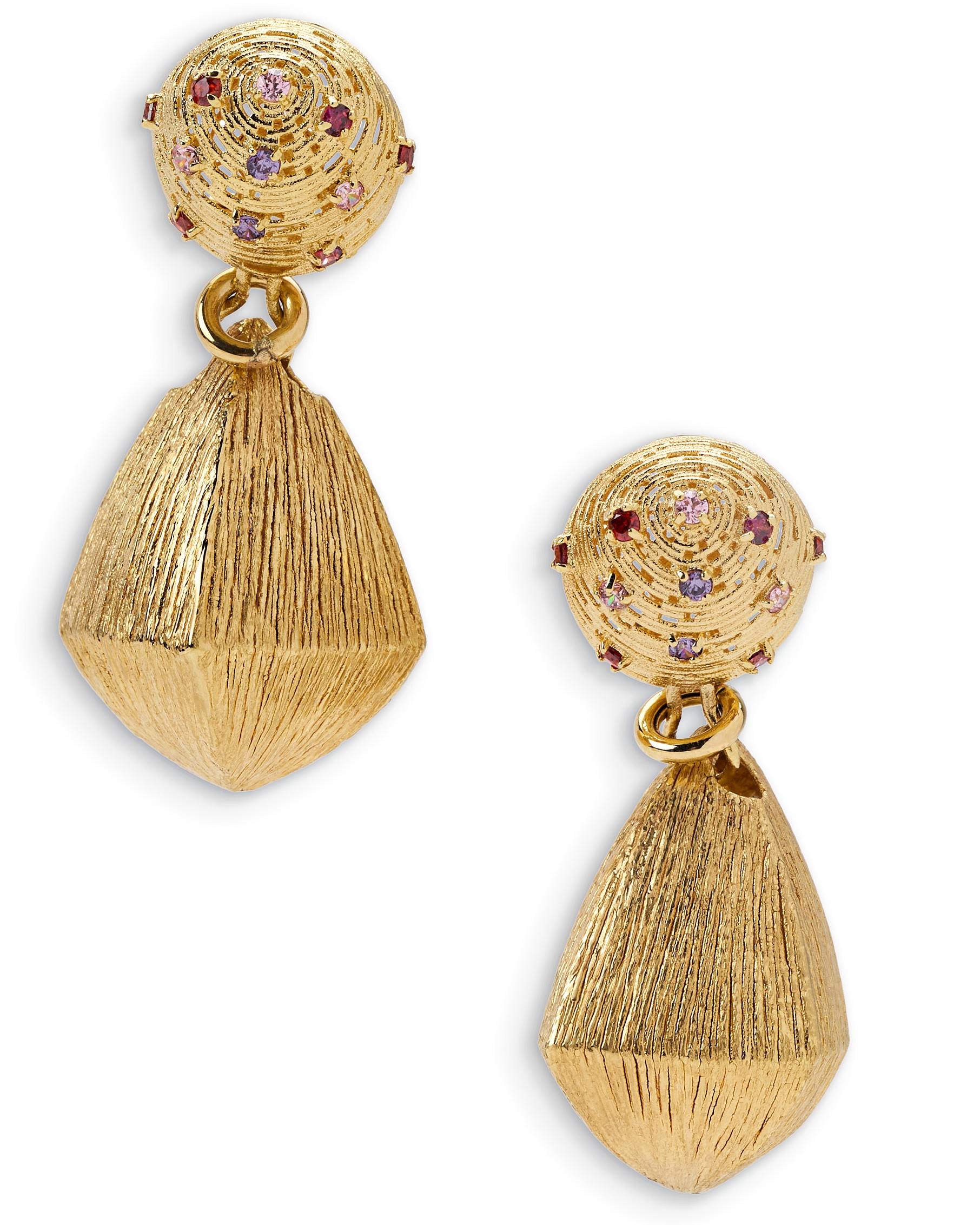 These K14 gold earrings feature a bold textured design with beautiful pink sapphires, red sapphires and amethyst semi precious stones, perfect for an outstanding look.