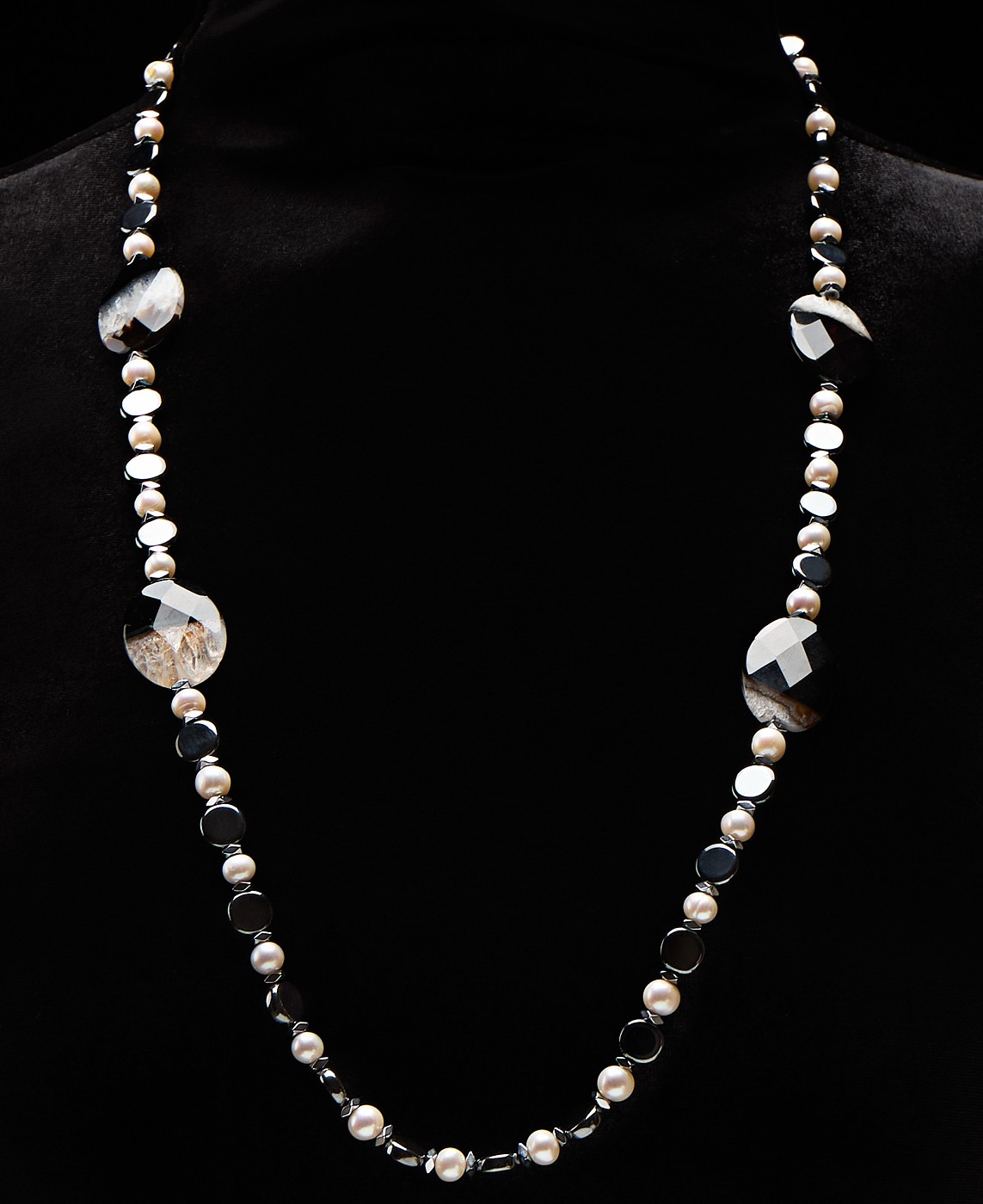 Silver necklace featuring the elegance of sweet water pearls combined with hematite and black spinel in between stones.