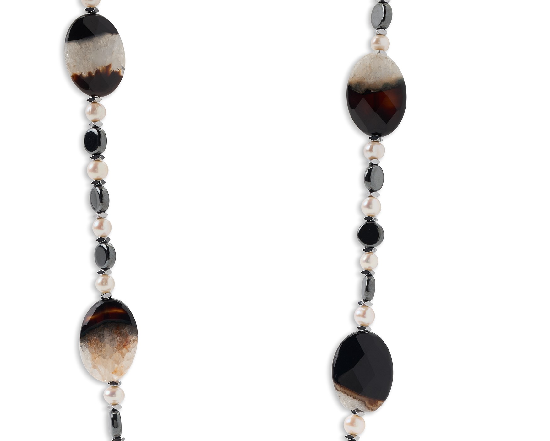 Silver necklace featuring the elegance of sweet water pearls combined with hematite and black spinel in between stones.