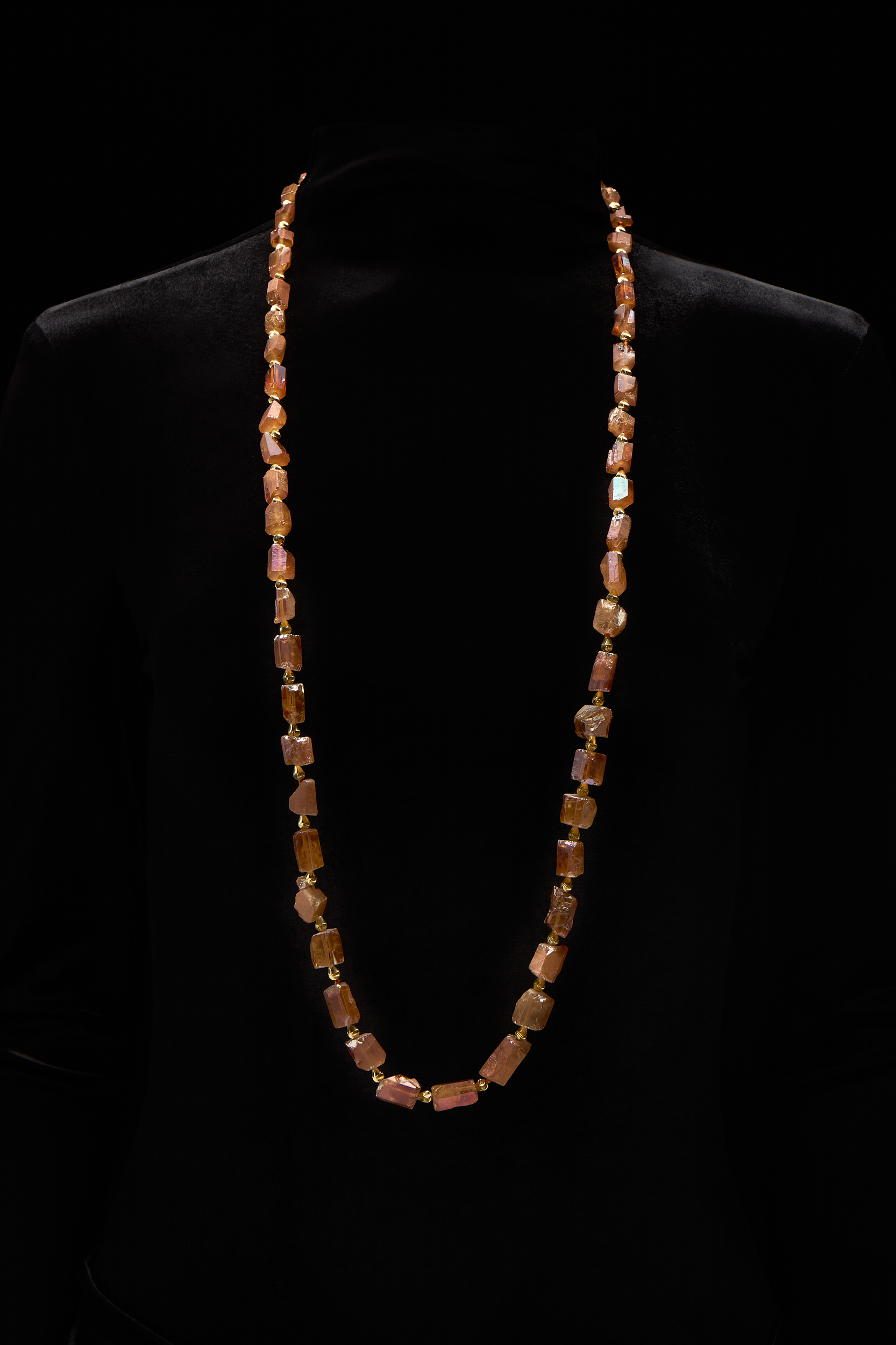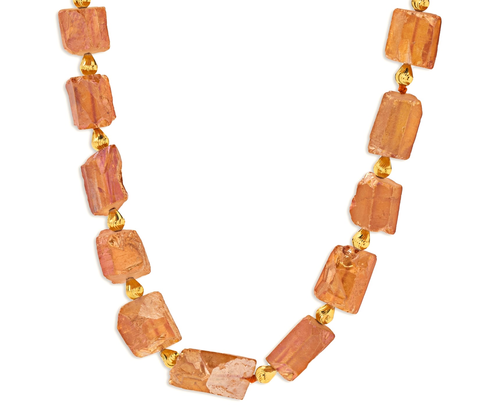 This gold-plated necklace is set with quartz semi-precious stones throughout, offering a shimmering, elegant look that catches the light beautifully.