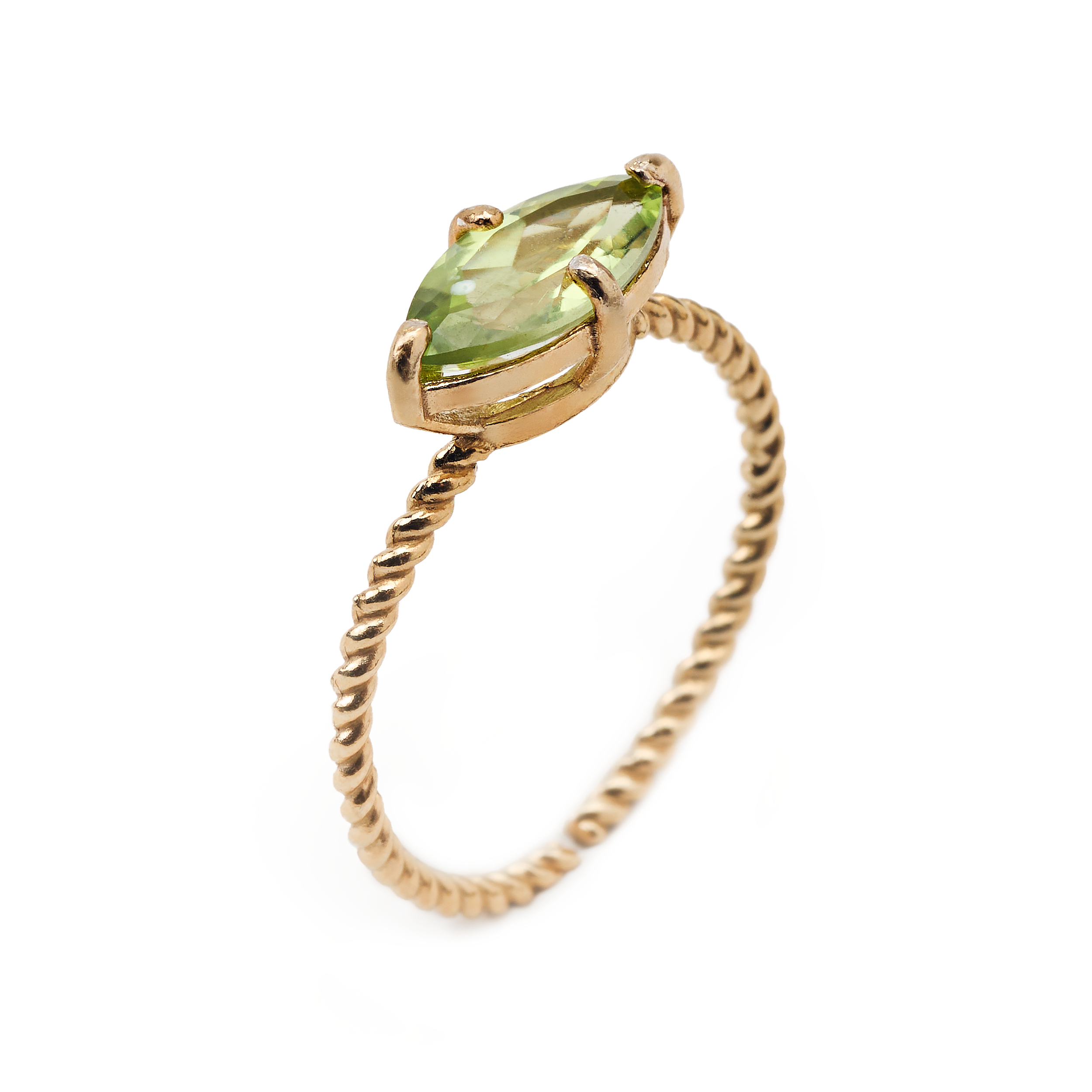 A sleek gold-plated ring set with a vibrant peridot semi precious stone, its fresh lime-green glow adding a lively touch to the warm golden band.
