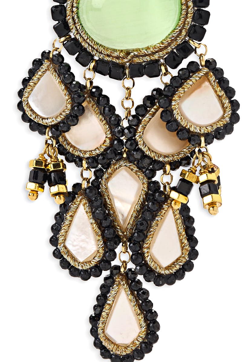 These gold-plated chandelier earrings showcase smooth light-green jade centers framed with black beading, complemented by cascading mother-of-pearl teardrops and gold accents for a bold, elegant finish.