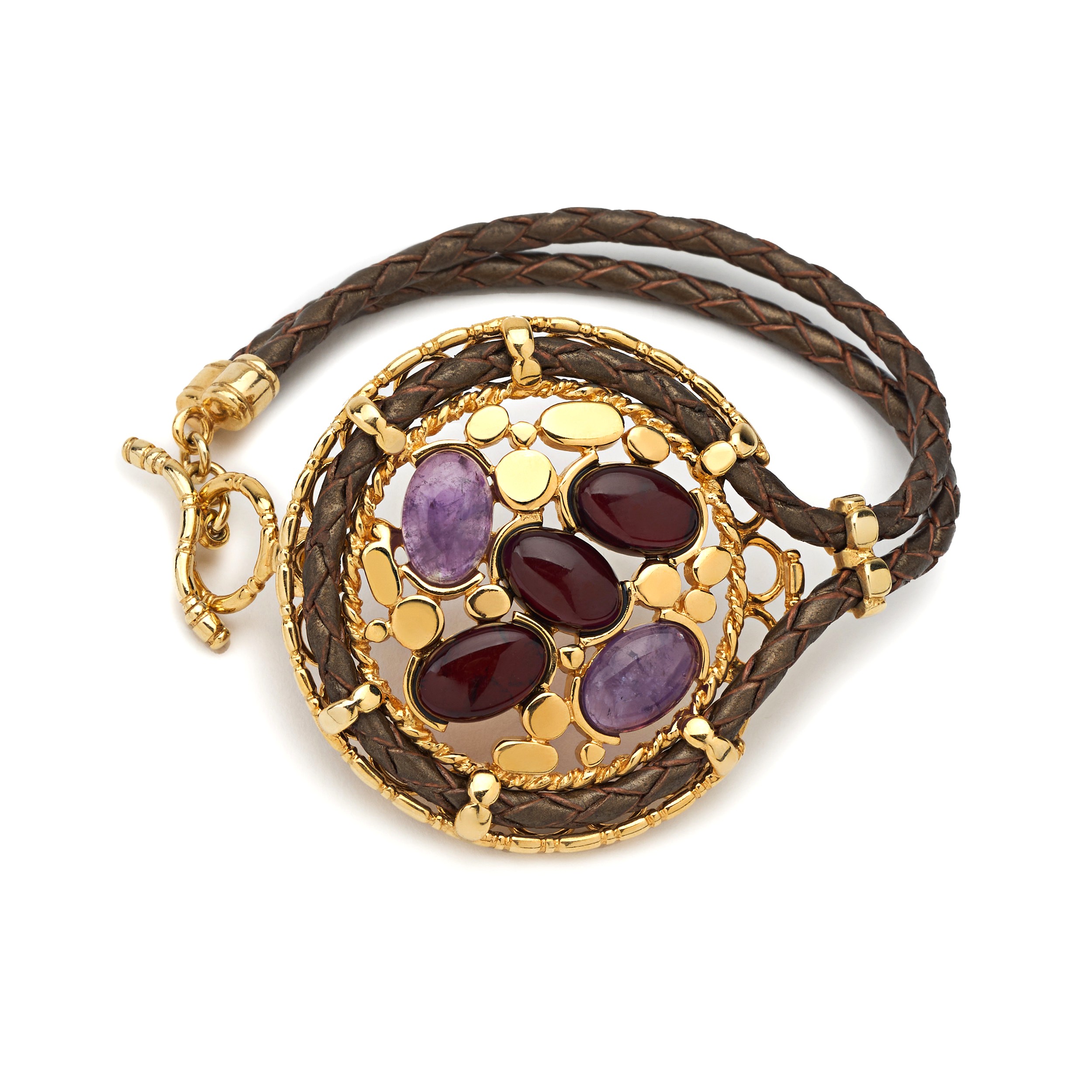 A gold-plated leather bracelet accented with warm garnet and amethyst semi precious stones, combining natural elegance with casual style.