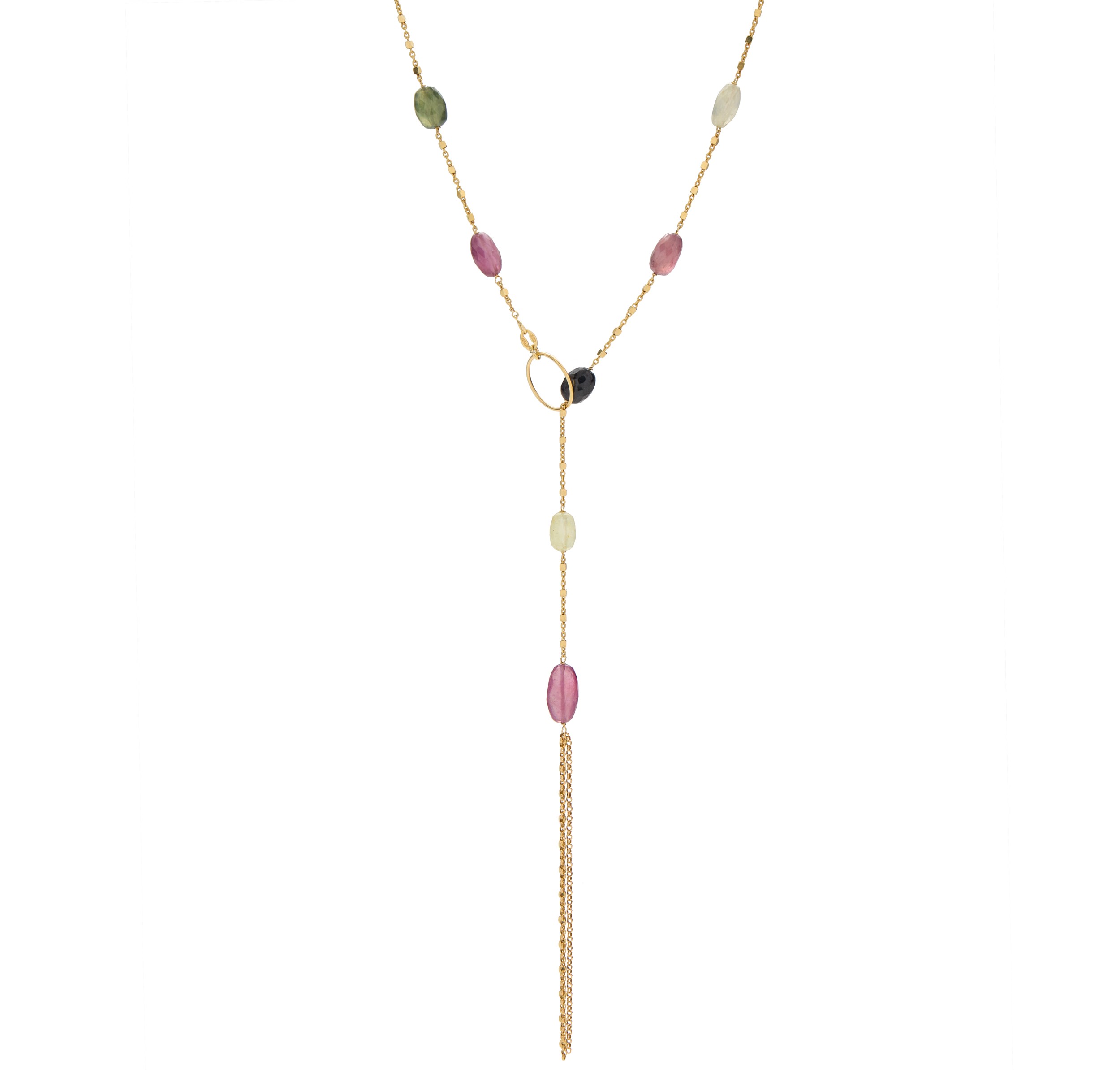 This gold-plated necklace features tourmaline semi-precious stones in a clean, modern design with vibrant, elegant color.