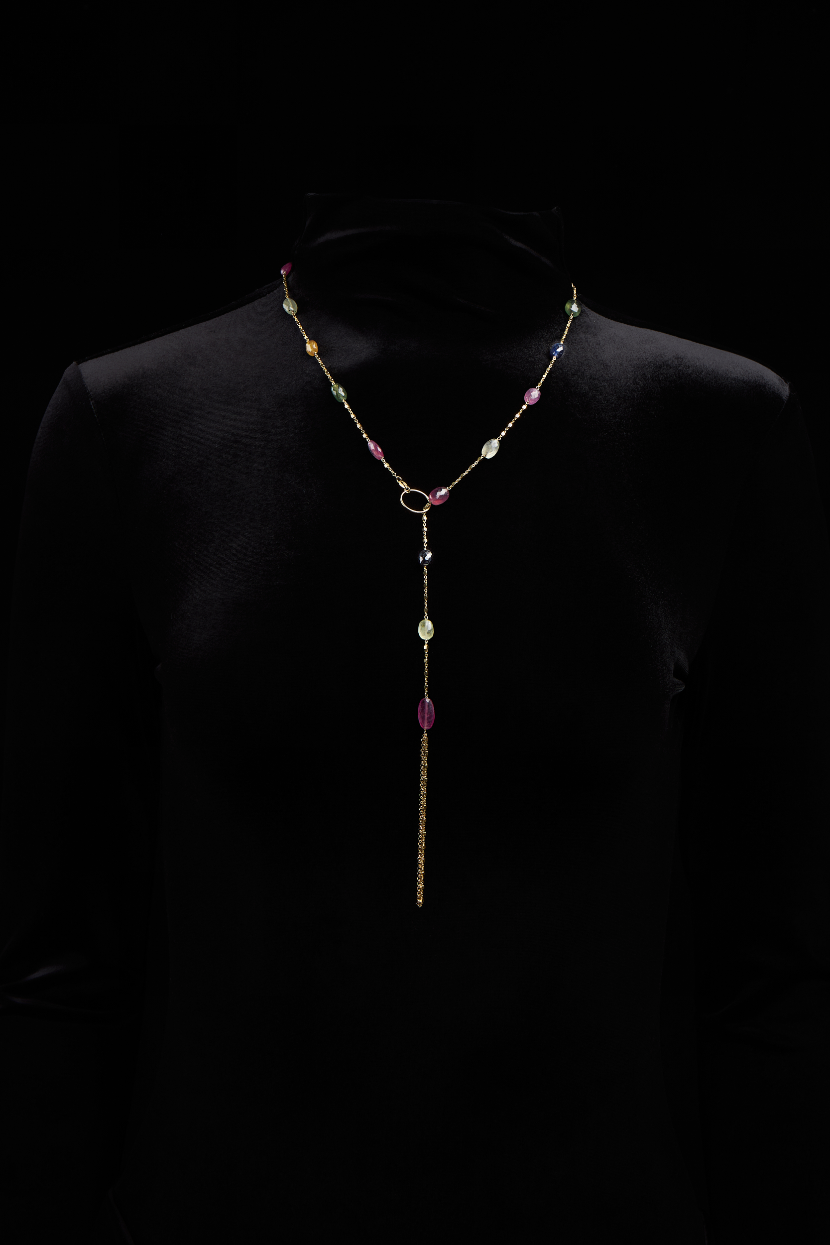 This gold-plated necklace features tourmaline semi-precious stones in a clean, modern design with vibrant, elegant color.