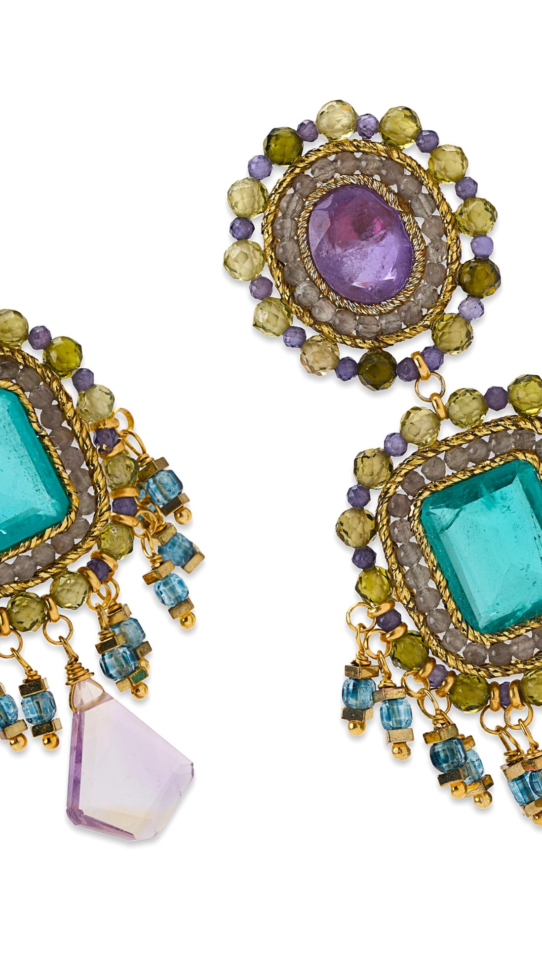 These exquisite silver gold-plated earrings feature luminous amethyst and emerald surrounded by jade semi-precious stones. Their rich purple and green tones radiating sophistication and irresistible elegance.