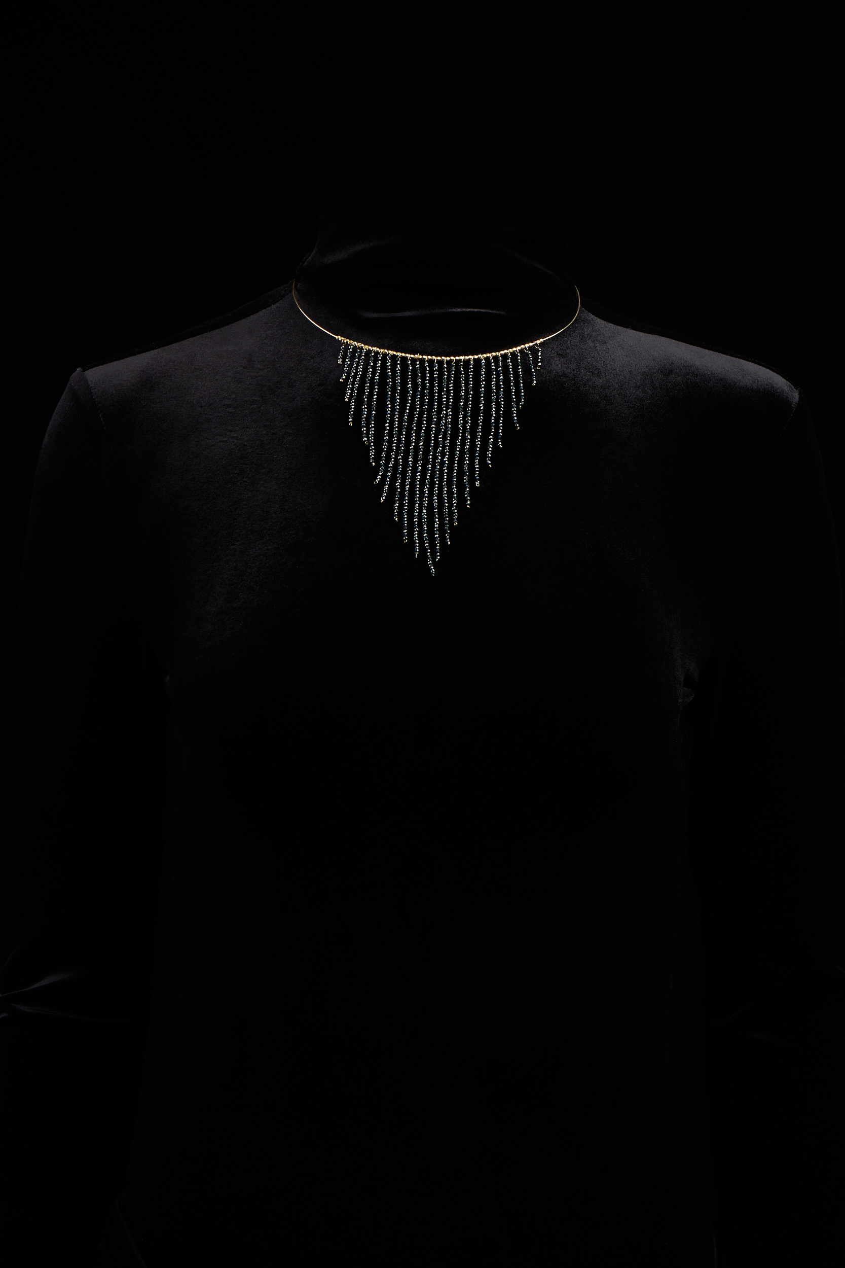 A gold-plated fringe necklace with a contemporary design that adds texture, shine, and movement with sparkling spinels semi precious stones.
