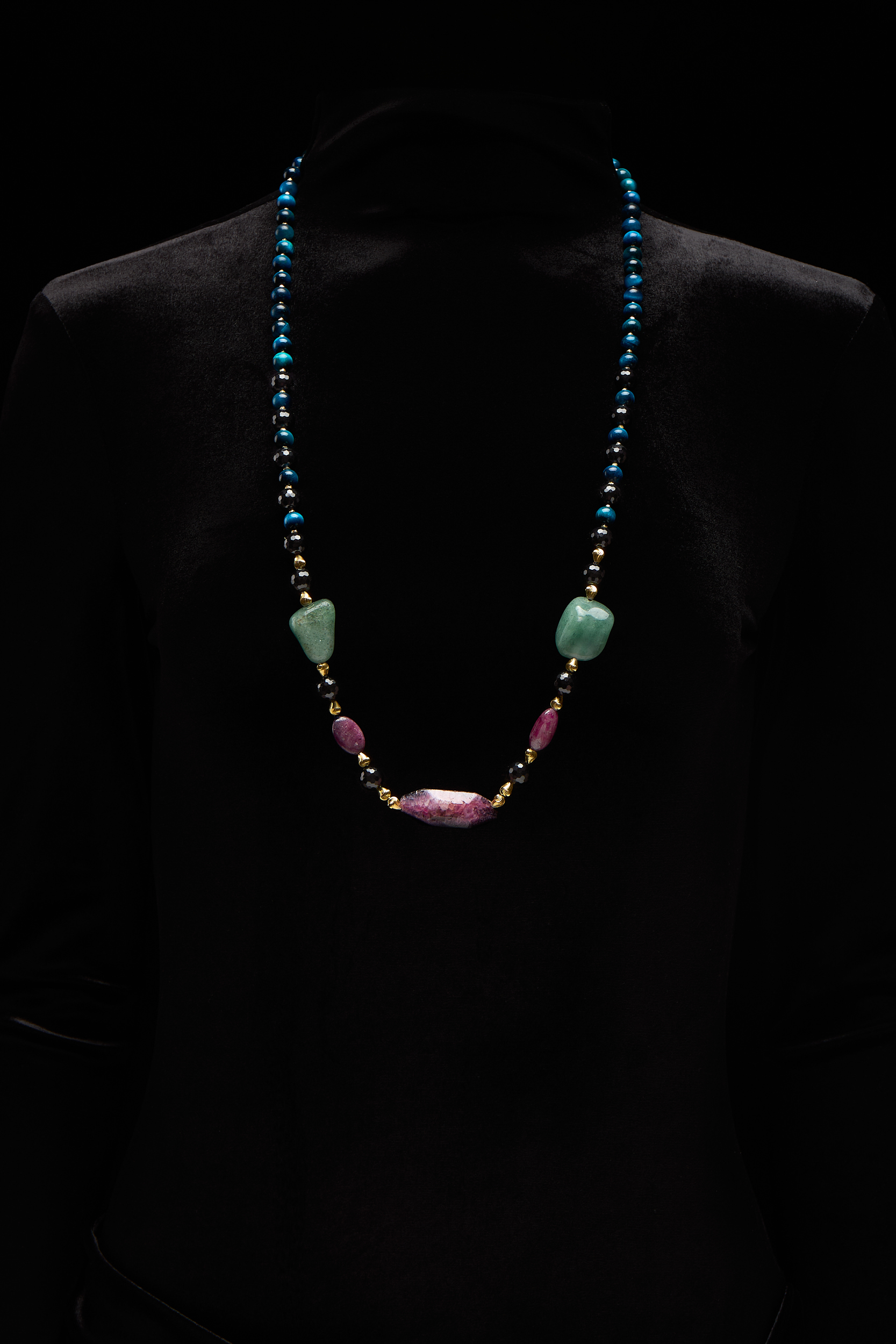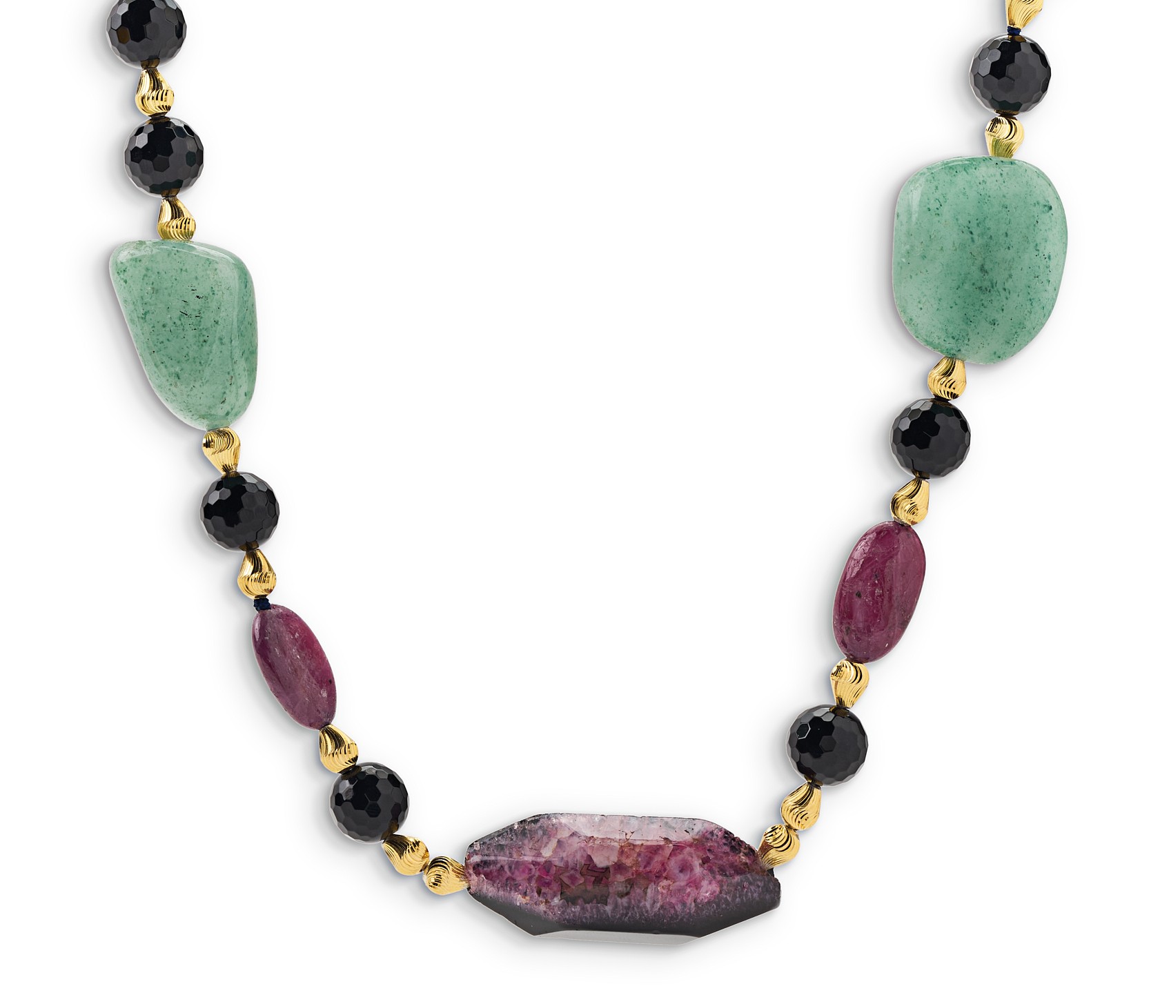 This gold-plated necklace is adorned with chalcedony, pink agate, onyx and hematite, creating a stylish and contemporary design with a harmonious blend of natural tones.