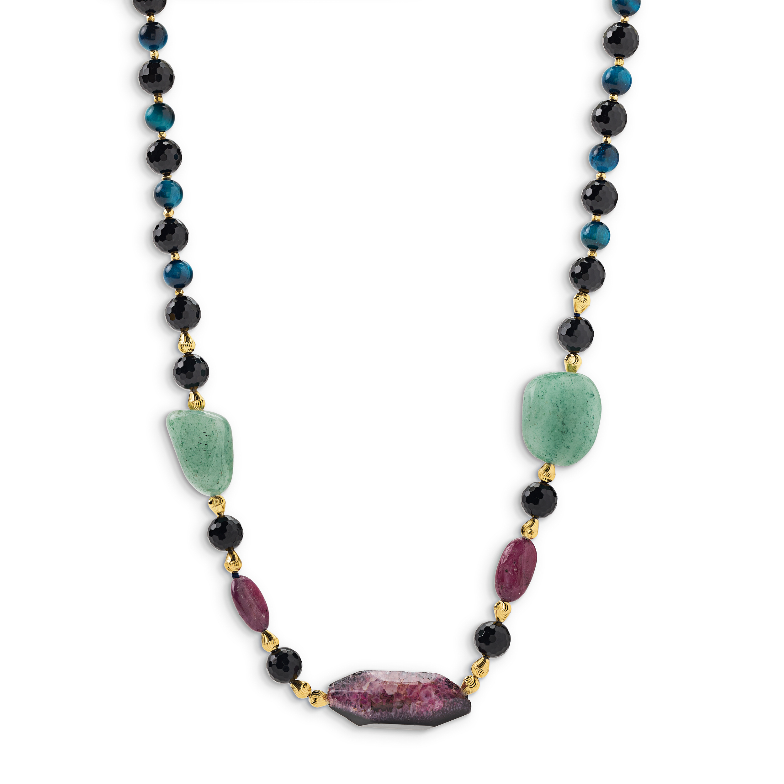 Categories: NEW IN, Petranova NecklacesThis gold-plated necklace is adorned with chalcedony, pink agate, onyx and hematite, creating a stylish and contemporary design with a harmonious blend of natural tones.