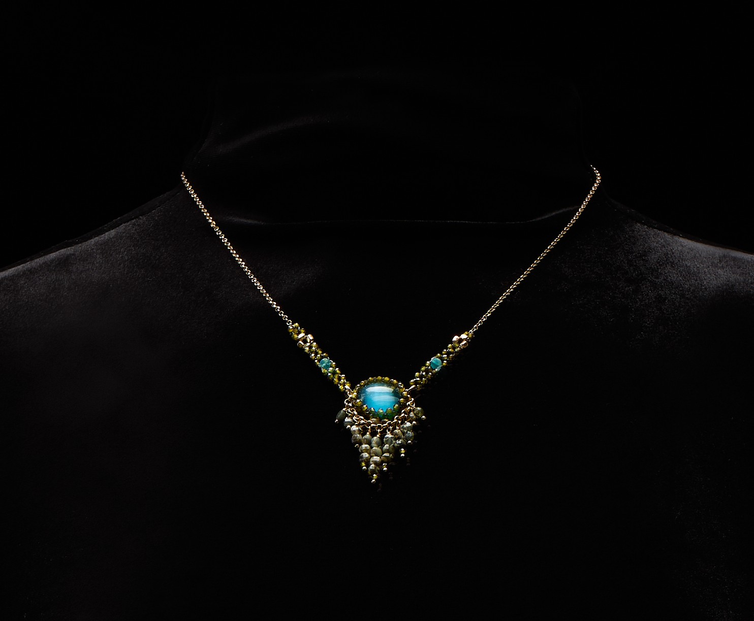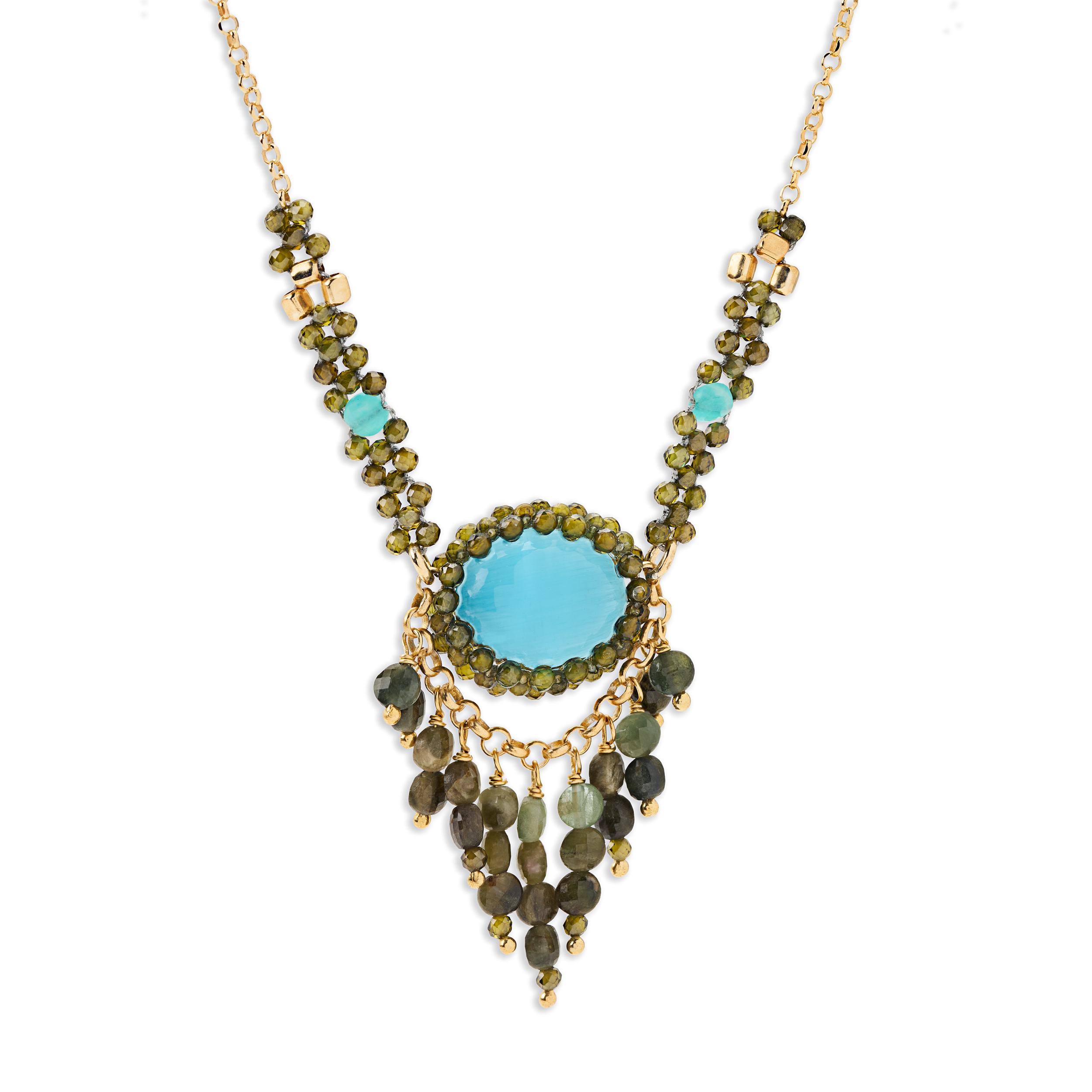 Gold-plated necklace with aqua marine and earthy tourmaline hues, creating a natural, free-spirited look with a touch of elegance.
