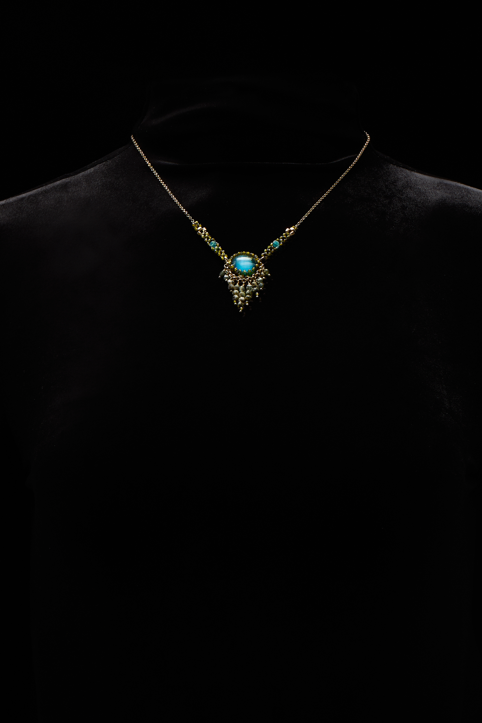 Gold-plated necklace with aqua marine and earthy tourmaline hues, creating a natural, free-spirited look with a touch of elegance.