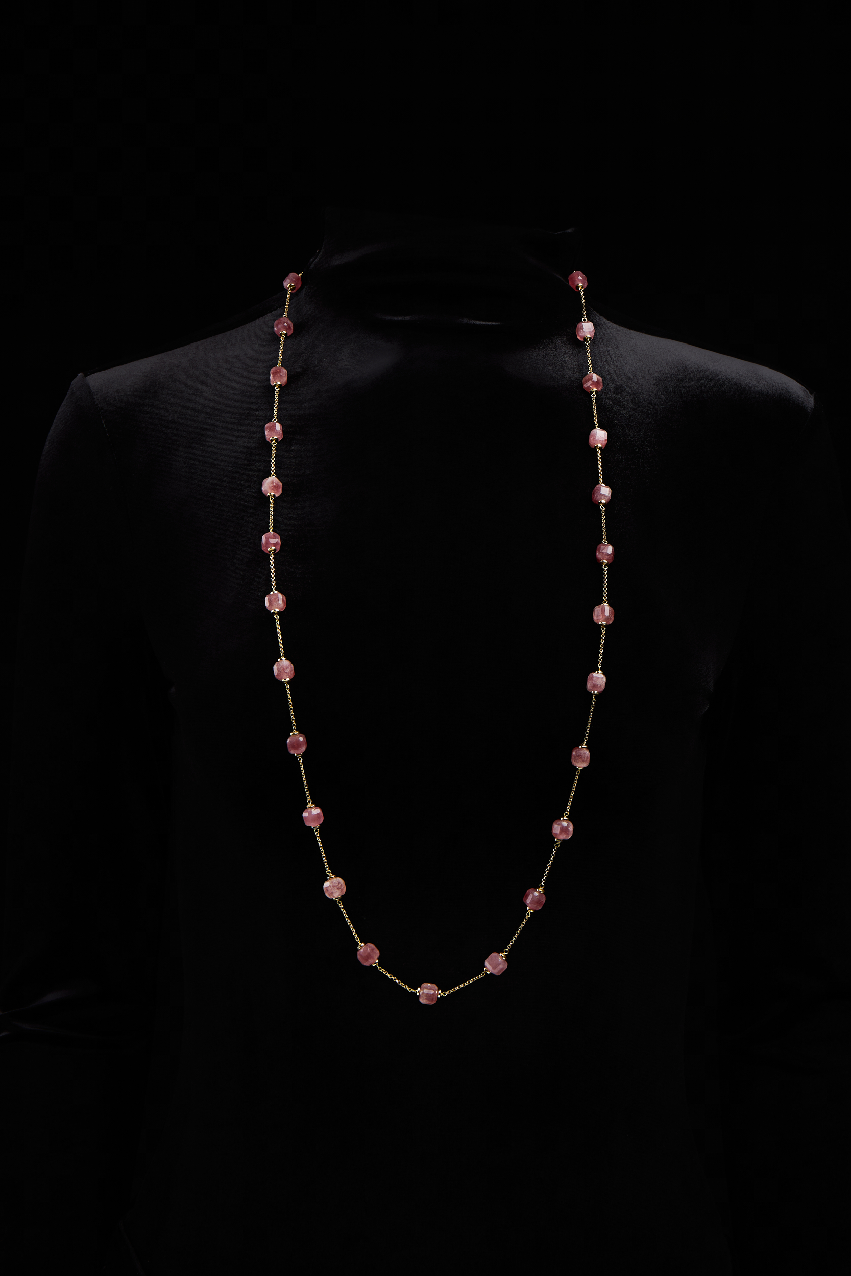 This gold-plated necklace features garnet semi precious stones, offering a rich, deep red color and an elegant, timeless design.