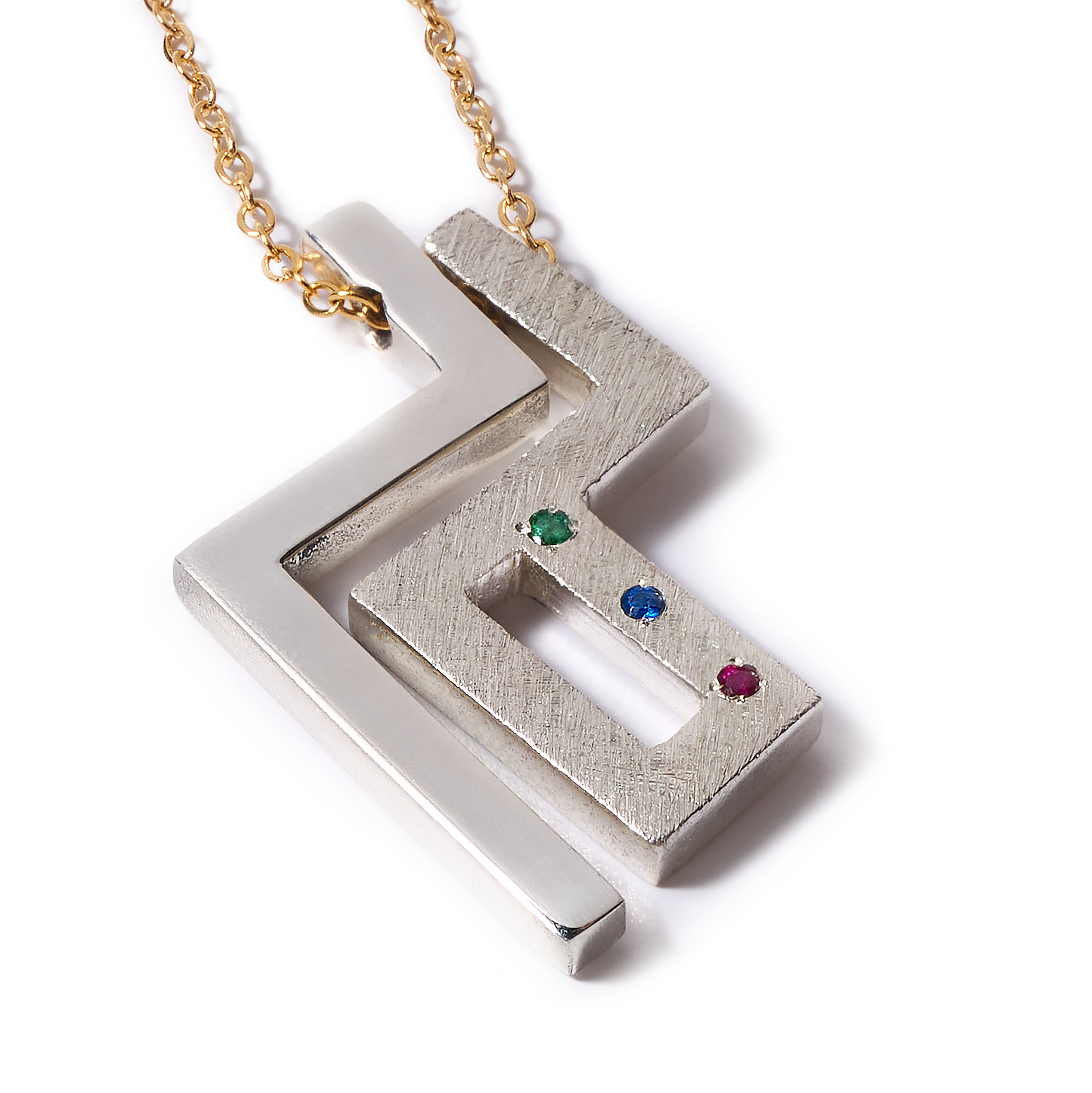 A silver 925 necklace featuring a lucky charm. This pendant features a striking two-tone geometric design made from contrasting finishes: