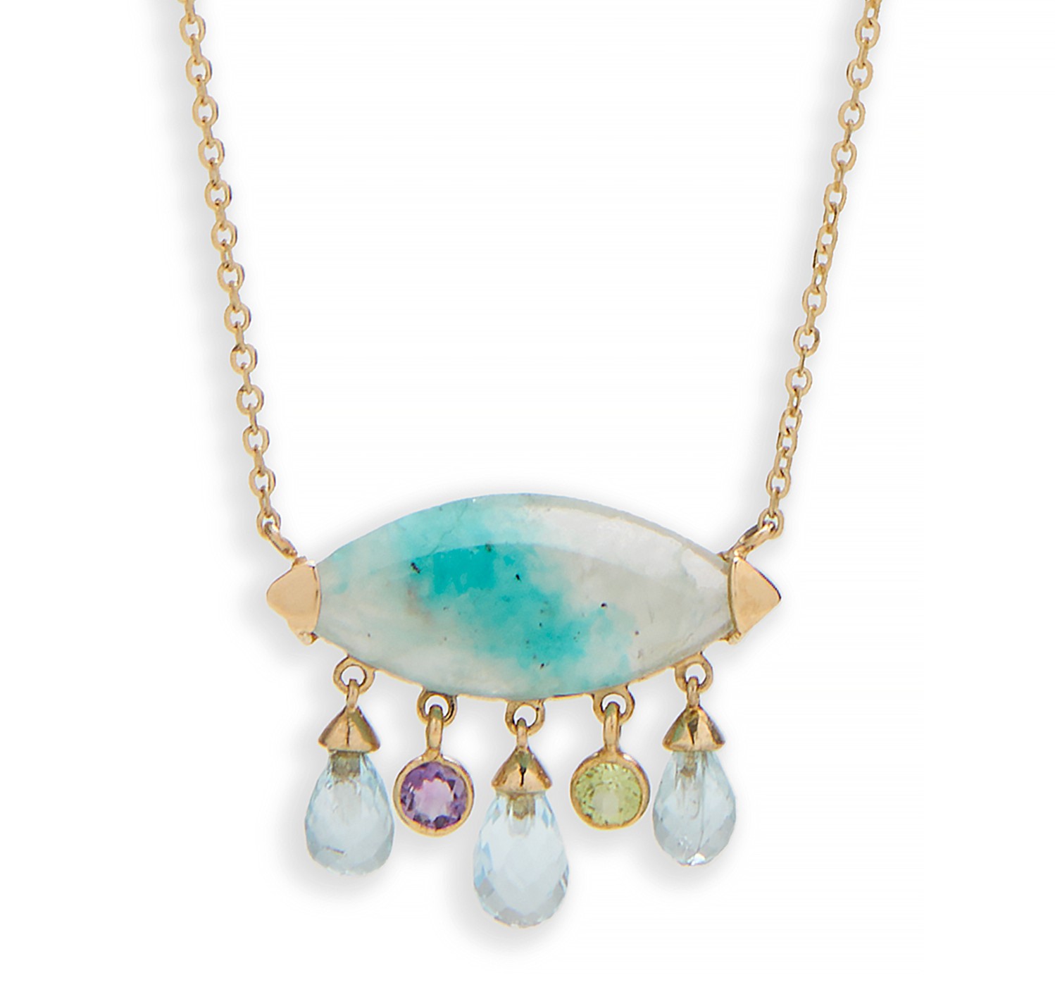 This 14K gold necklace features amazonite at the center, beautifully surrounded by amethyst, peridot, and aquamarine semi precious stones, creating a vibrant and elegant design.