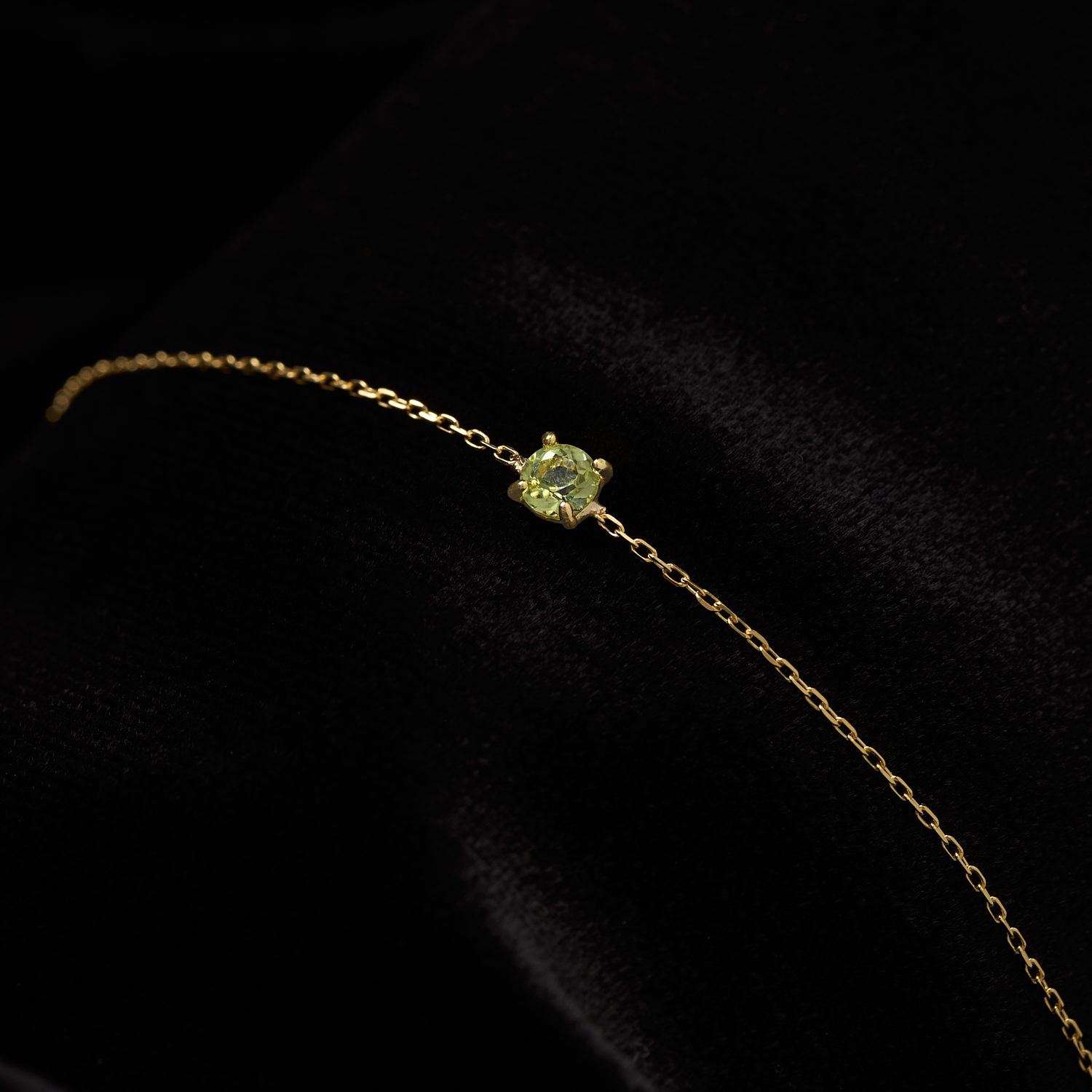 K18 gold bracelet, holding a glowing peridot stone. A simple, minimal design that sits subtly on the wrist.