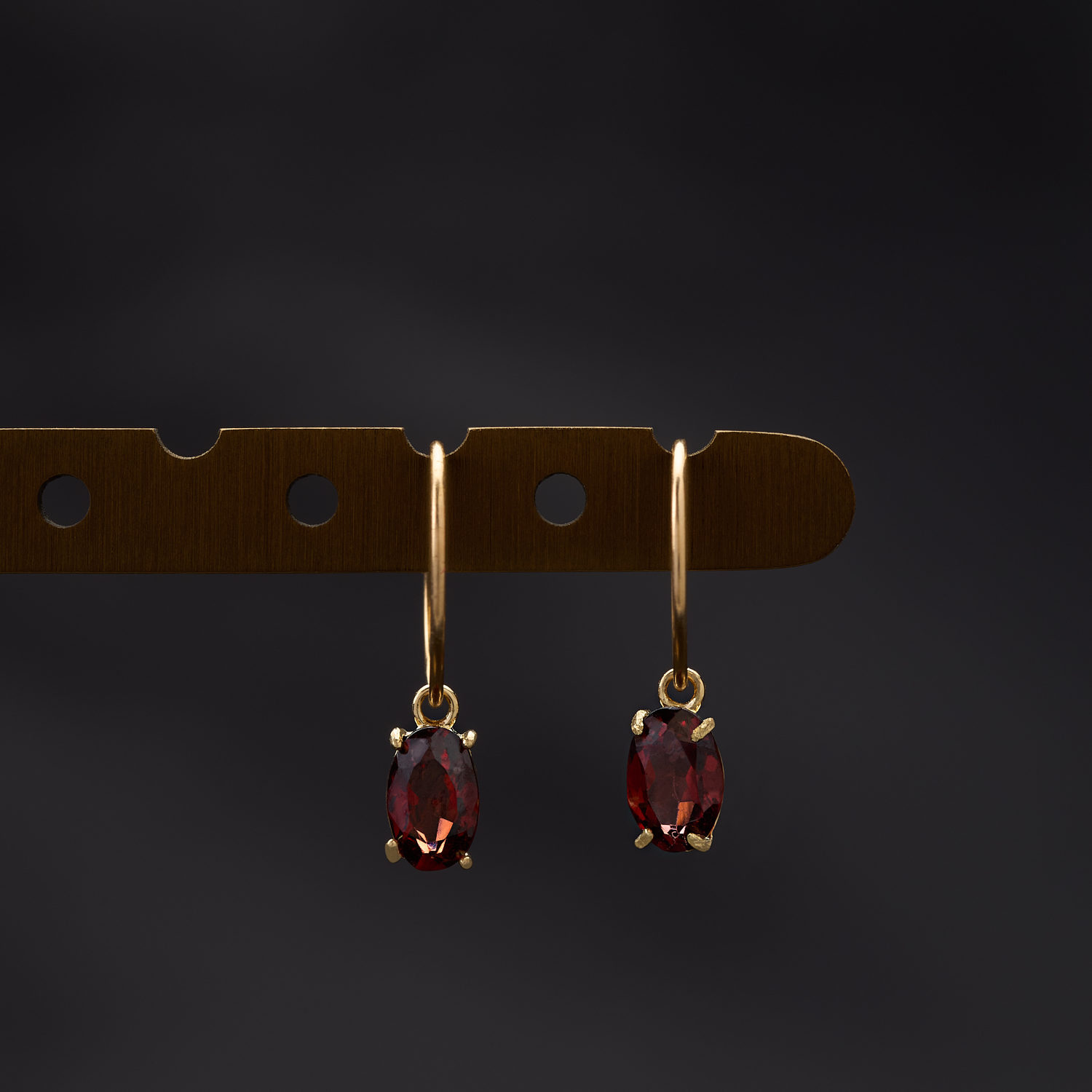 K18 gold earrings enclosing a brilliant ruby. Lightweight and understated, offering an elegant, everyday look.