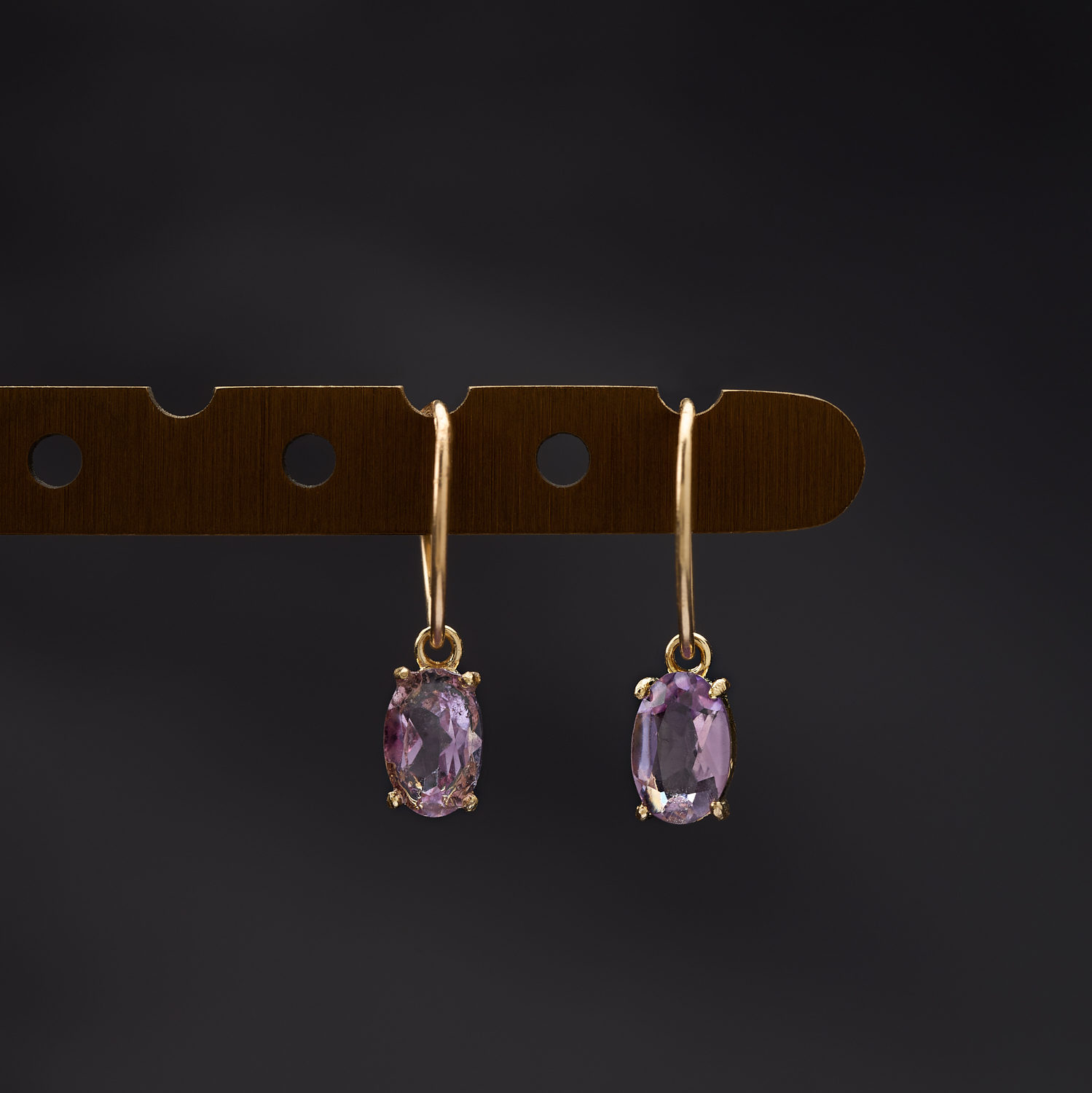 K18 gold earrings holding a glowing amethyst stone. Perfect for a refined, every day style.