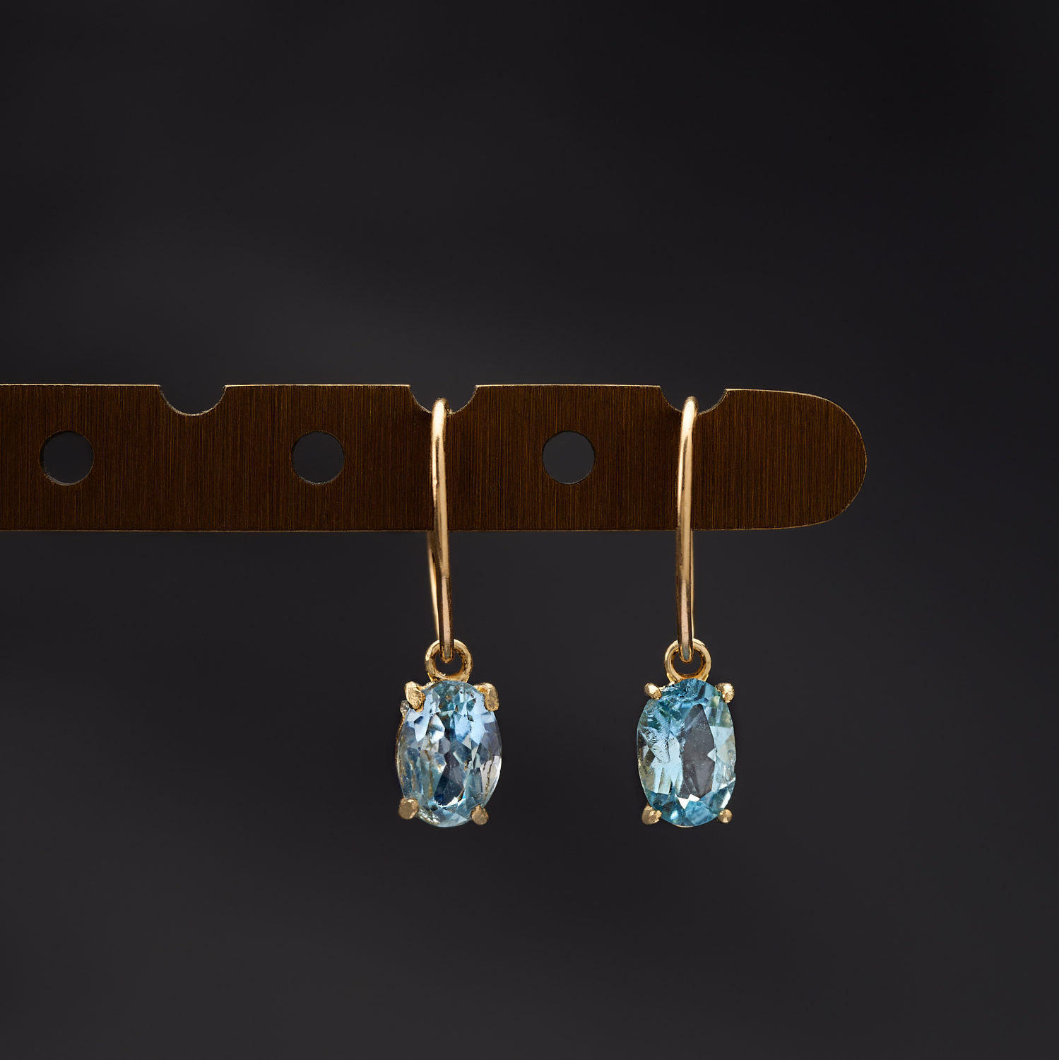 K18 gold earrings featuring a brilliant blue topaz stone. An elegant, clean, minimal design, for every day style.