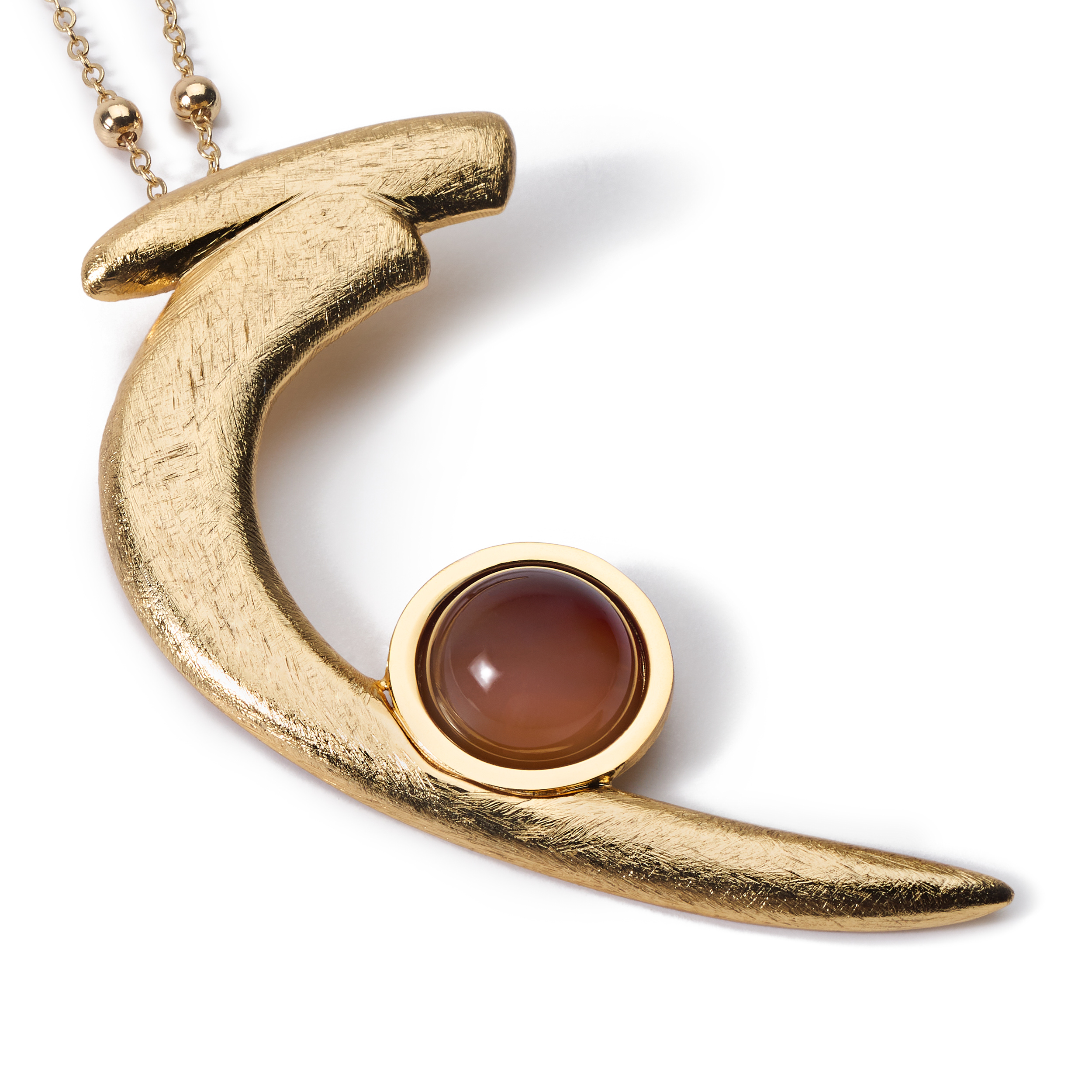 Its shape curves gracefully. At the inner curve sits a smooth, round cabochon gemstone—a warm brown, translucent agate stone. It’s bezel-set in polished gold-tone metal, creating a striking contrast with the matte brushed texture around it.