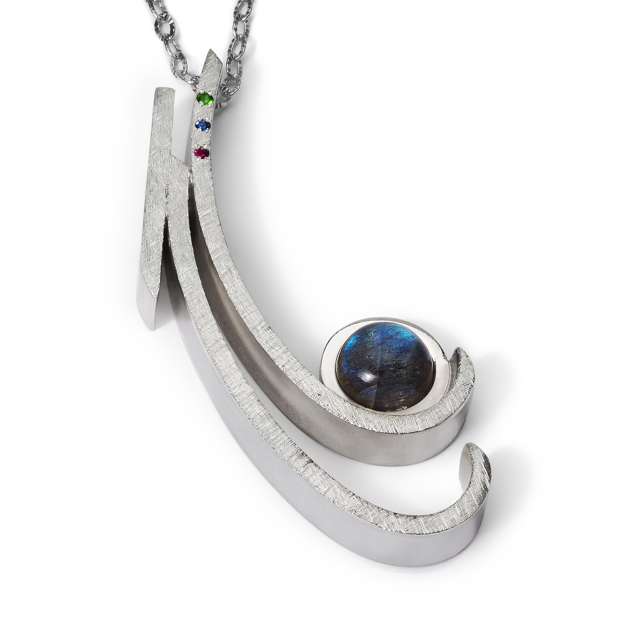 A hand made silver 925 lucky charm pendant with an intricate, flowing design that elegantly cradles a variety of stones such as emerald, sapphire, ruby completed by, a marvelous labradorite. Delicate curves and fine detailing create a sense of movement and sophistication, making the charm refined, stylish, and full of character.