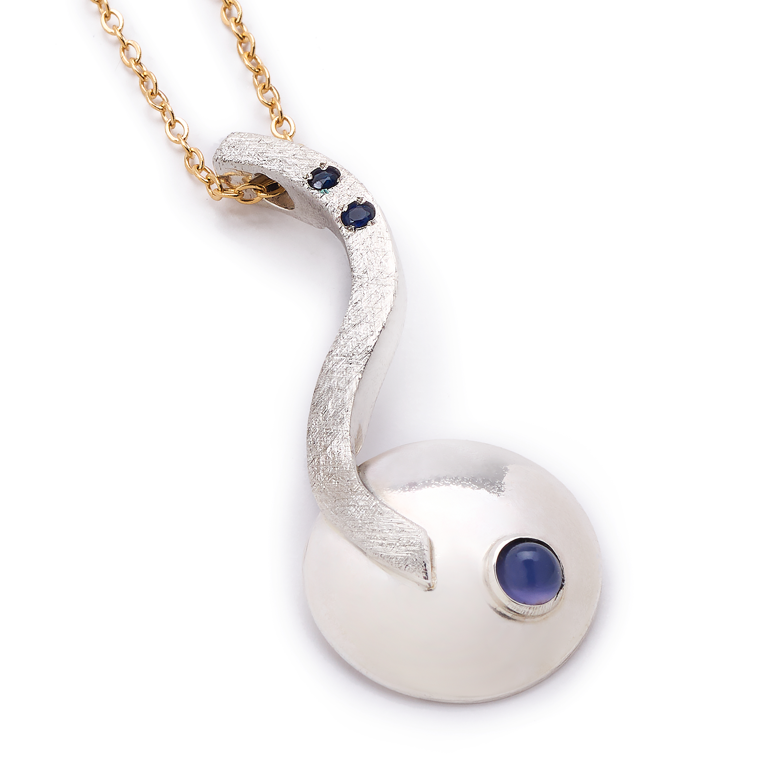 A hand made silver 925 lucky charm pendant with an elegant, intricate design that beautifully frames a blue agate stone, combined with three glowing sapphires. Graceful curves and detailed goldwork give the piece a refined, stylish look, highlighting the charm’s sophistication and sense of luck.