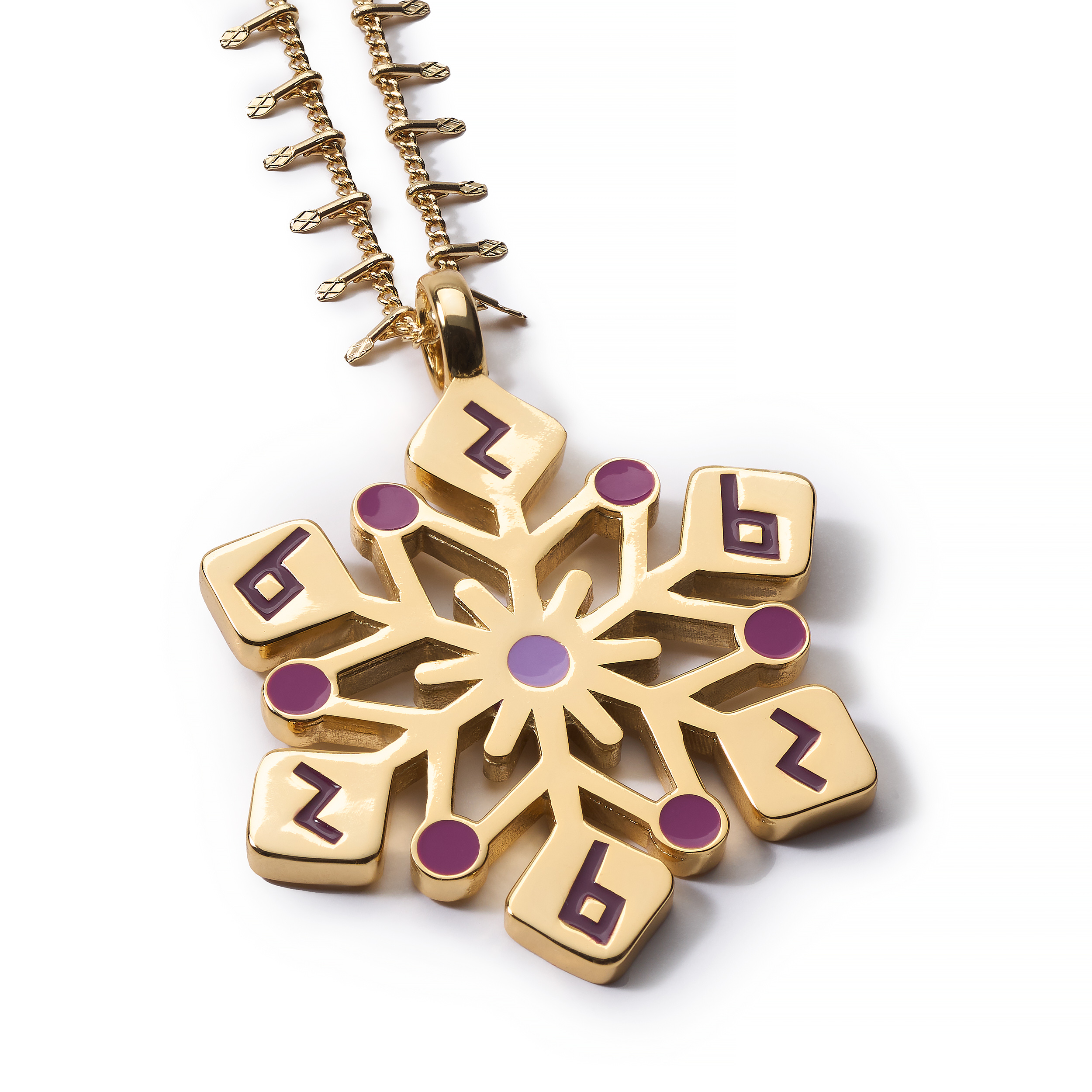 A gold-plated lucky charm pendant featuring an elegant, symmetrical design inspired by a snowflake. Accented with delicate purple inlays, it offers a refined contrast that enhances its intricate details. It combines timeless sophistication with a subtle, mystical allure.